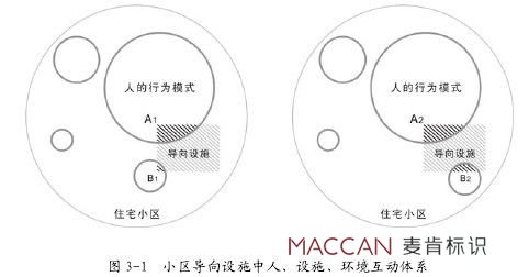 住宅小區(qū)導(dǎo)向設(shè)施中人、設(shè)施和環(huán)境的互動(dòng)體系實(shí)質(zhì)是一個(gè)動(dòng)態(tài)的、連續(xù)性的過程,而不是某個(gè)靜止的、片段的動(dòng)作行為(見圖 3-1)。因?yàn)槿说男袨槟J接屑榷ǖ囊?guī)律部分也有很多隨機(jī)的部分,由此帶來了此互動(dòng)體系中一些較固定的行為現(xiàn)象(如圖中的交集 A1 和 A2),同時(shí)也存在一些動(dòng)態(tài)變化的部分(如圖中的交集 B1 和 B2)。