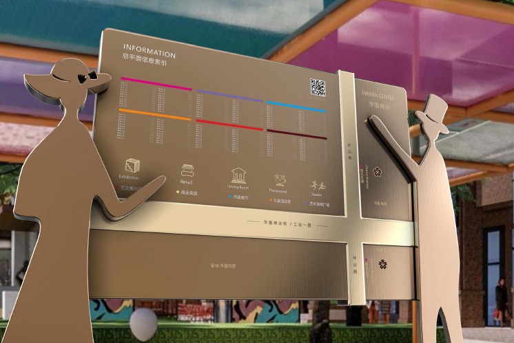 導(dǎo)視設(shè)計(jì)里的“華先生”,整體形態(tài)采用較為夸張的藝術(shù)手法,略去了五官輪廓,手腳形態(tài)抽象化,體態(tài)圓潤化,有時(shí)較為夸張的動(dòng)態(tài)姿勢(shì),在空間中表現(xiàn)更具親和力。在華盈里享受生活的同時(shí),導(dǎo)視牌也不再局限于指引的功能,每一件導(dǎo)視作品都如一件藝術(shù)品,與人產(chǎn)生了共鳴。
