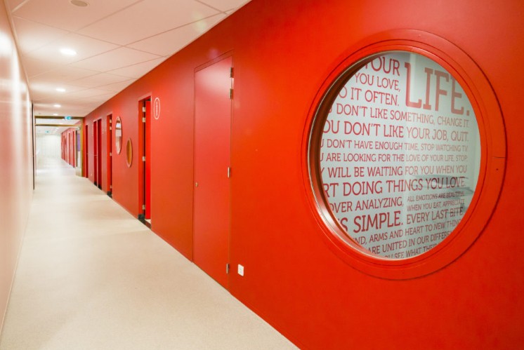 為了與內(nèi)壁的圓形窗戶(hù)相呼應(yīng),學(xué)校導(dǎo)視設(shè)計(jì)機(jī)構(gòu)把標(biāo)識(shí)的所有元素都圈起來(lái)。他們?yōu)榫哂刑囟üδ艿姆块g開(kāi)發(fā)了清晰的圖標(biāo),并將這些圖標(biāo)固定在玻璃門(mén)上。樓梯間的墻壁上布滿(mǎn)了學(xué)校自主選擇的激勵(lì)人心的文字。寬大的樓梯欄桿(附件書(shū)架)之上排列著Mies Boshuys的一首詩(shī)。標(biāo)識(shí)與室內(nèi)空間合二為一,整體成為現(xiàn)代簡(jiǎn)約建筑的寶貴財(cái)富。