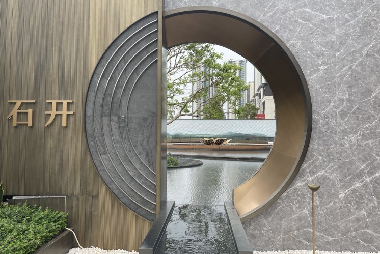 云境十觀 ,大有可觀。從引-“府門”,探-“金鱗、石開、鎏金”到尋、悅-“浮橋、云池、金盤、參天”,享-“幽巷、靈石”,途中的布景由鱗片到頑石,由金光到流水,硬朗的外衣下金光淅瀝,暗指從披荊斬棘到開石現(xiàn)金的壯麗之旅。處處精致的細節(jié),是麥肯標識設計師對環(huán)境視覺設計的熱愛與堅守,于繁華喧囂之市,給重地脈、尚吉瑞的順德人,打造了一方講究又優(yōu)雅的詩意園林。