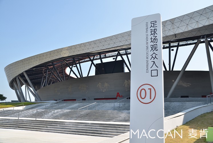 優(yōu)秀的標(biāo)識不僅是使用者一目了然,導(dǎo)向標(biāo)識能夠給不同國際、不同語言提供方向信息,讓各種語言的人群均能理解,應(yīng)對重要國際賽事通道不成問題。例如麥肯設(shè)計的江門濱江體育中心的標(biāo)識系統(tǒng),體育館入口中英文標(biāo)識對照映入眼簾。體育館內(nèi)部,使用國際通用標(biāo)識牌,不同地區(qū)的人們可以理解其中的內(nèi)容。