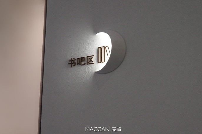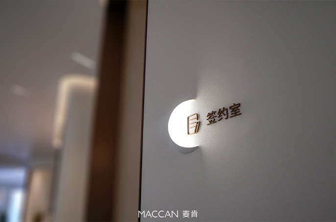 進入營銷中心欣賞室內(nèi)的陳設(shè),標識采用和榮西灣的“彎”的形狀,走進一處彎月細節(jié),整體圖標是圓角曲線的線條形式,與項目整體藝術(shù)氛圍相契合,頗為現(xiàn)代活潑、自然靈動之感。設(shè)計師們心生明月,留下一物一景的無窮趣味。