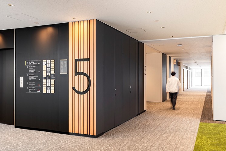 在大樓的低層空間,天花板的設(shè)計采用了水平流動的木材條紋,這些條紋不僅在視覺上延伸了空間,還一直延伸到頂層,創(chuàng)造出一種連續(xù)的視覺效果。這增強了空間的層次感,還為訪客提供了一種清晰的方向指引。為了進(jìn)一步強化空間結(jié)構(gòu)的可理解性,設(shè)計團(tuán)隊將包括垂直運動線在內(nèi)的核心部分用深灰色包圍。這種深灰色的使用不僅使核心部分在視覺上更加突出,還保持了整體空間的平靜和穩(wěn)重。通過這種方式,導(dǎo)視系統(tǒng)不僅提供了清晰的方向指引,還增強了建筑的整體感和連貫性。