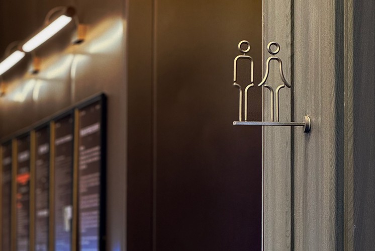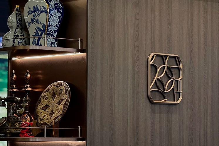 散落各處的古銅色三維尖錐立體字,通過精密鍛造工藝塑造出強(qiáng)烈立體感,尖錐造型的力量感與古銅材質(zhì)的奢華感交織,讓每一處標(biāo)識(shí)都成為藝術(shù)品。立體字在光線下折射出細(xì)膩紋理,因光線變化呈現(xiàn)的深淺質(zhì)感,讓標(biāo)識(shí)成為空間里的 “光影玩家”。