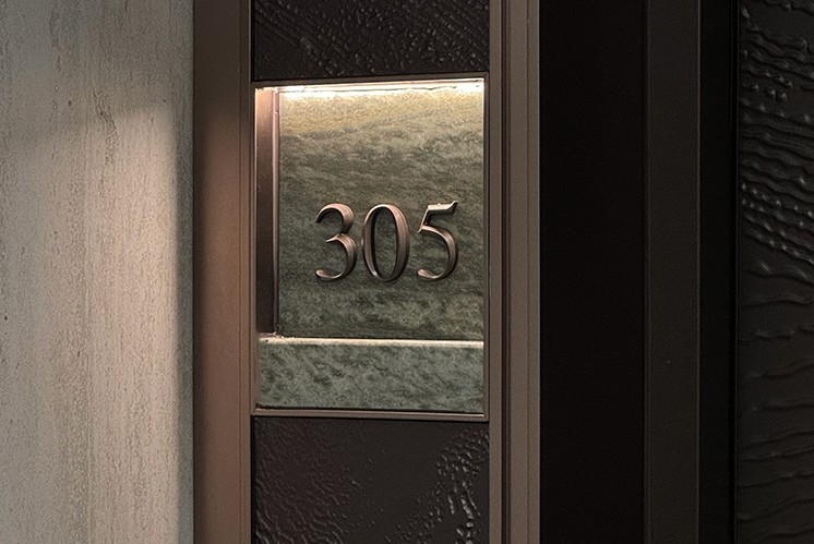 入口處的景墻案名標(biāo)識(shí),采用具有豐富紋理的古銅色背板,與立體字組合出時(shí)光的肌理,彰顯現(xiàn)代精致。