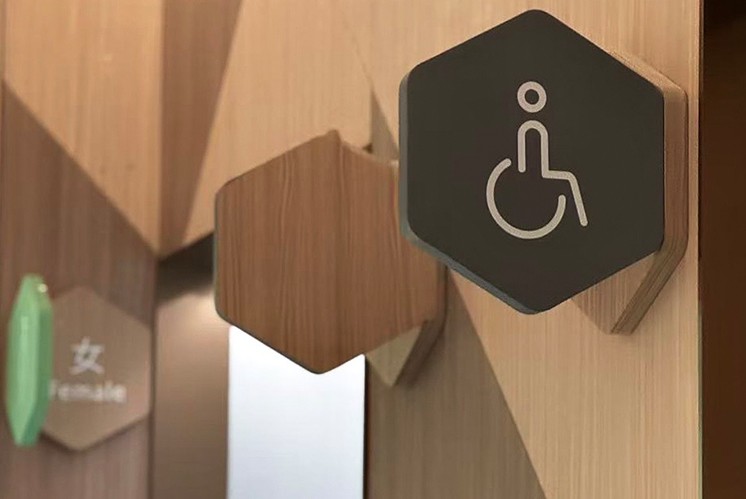 不同樓層信息以 “塊” 為單元有序堆疊,既像孩童搭積木般充滿趣味,又能讓訪客快速捕捉空間信息。無(wú)障礙標(biāo)識(shí)、衛(wèi)生間指引等細(xì)節(jié)處,木質(zhì)與幾何造型的結(jié)合,更將人性化關(guān)懷藏進(jìn)自然美學(xué)的肌理。