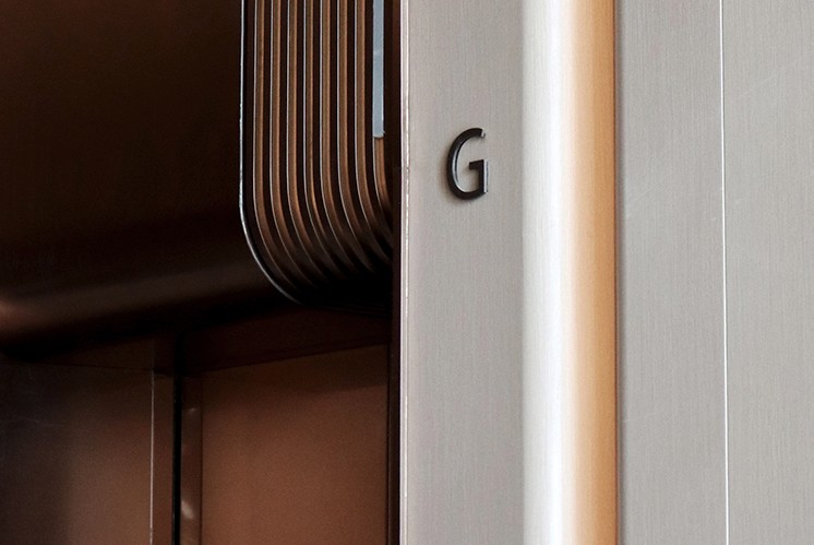 樓層標(biāo)識(shí)在燈光映襯下清晰醒目,與空間中弧形木紋裝飾形成呼應(yīng),既實(shí)現(xiàn)了功能導(dǎo)視,又成為大廳藝術(shù)細(xì)節(jié)的一部分,讓來者在踏入辦公區(qū)域的第一刻,便感受到空間的雅致格調(diào)。