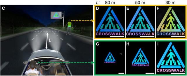 在實(shí)驗(yàn)中,研究人員用這種反光薄膜制作了一個(gè)帶有數(shù)字和字母的限速標(biāo)志,并在它附近放置了一盞白色光源。結(jié)果顯示,當(dāng)駕駛員快速的通過時(shí),能看到標(biāo)志上的內(nèi)容似乎隨著位置的移動(dòng)而閃爍;在另一組實(shí)驗(yàn)中,研究人員把這種反光材料貼在車道線上,結(jié)果車輛經(jīng)過時(shí)能看出車道線反射了前車的燈光,變得很明亮。對(duì)于駕駛員來說,標(biāo)志上的顏色明亮而穩(wěn)定,但對(duì)于路邊的行人來說,路標(biāo)的顏色似乎在隨著汽車的飛馳和燈光的照射而閃爍。