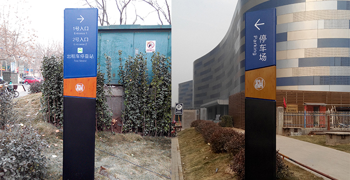 麥肯團(tuán)隊(duì)對(duì)SM淄博淄川城市廣場(chǎng)的空間形態(tài)、建筑造型、外觀裝飾風(fēng)格進(jìn)行實(shí)地考察,根據(jù)廣場(chǎng)主軸線景觀——綠洲,將標(biāo)識(shí)材料選定為不銹鋼與木紋搭配,與環(huán)境相融合。導(dǎo)視系統(tǒng)采用藍(lán)色作為點(diǎn)綴裝飾,既保持整體性,同時(shí)彰顯室內(nèi)設(shè)計(jì)的水系概念。